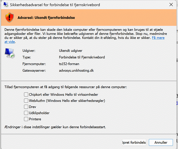 Vores RDP‑genveje til Unik Hosting er sikre og legitime. Når du fremover logger på, vil du se et ekstra sikkerhedsskærmbillede fra Windows: